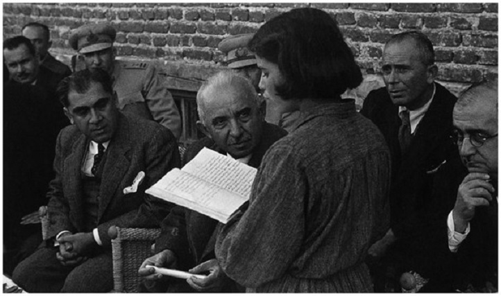 Bir kız öğrenci Milli Eğitim Bakanı Hasan Ali Yücel, Cumhurbaşkanı İsmet İnönü'nün huzurda yazdıklarını okuyor.