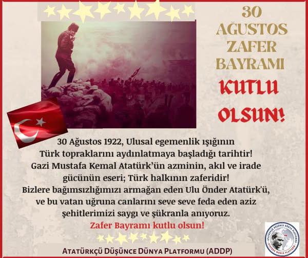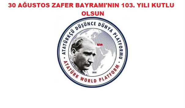 Atatürkçü Düşünce Dünya Platformu olarak bizler, 30 Ağustos Zafer Bayramı’nın 103.yılını, milli birlik ve beraberliğimizin en güçlü ifadesi olarak kutluyoruz. 30 Ağustos Zaferini Türk Milletine armağan eden başta Cumhuriyetimizin kurucusu Ebedi Başkomutan Büyük Önder Gazi Mustafa Kemal Atatürk olmak üzere, vatan uğrana canlarını feda eden silah arkadaşlarını, kadın, erkek, çocuk tüm kahramanlarımızı ve aziz şehitlerimizi şükran, minnet ve saygıyla anıyoruz.