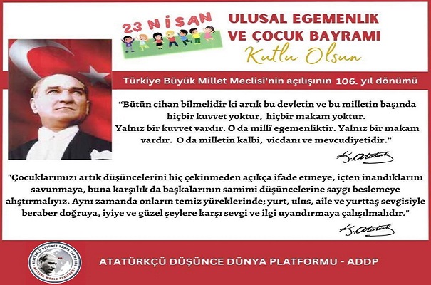 Bu bilinçle; başta Atatürk ve silah arkadaşları olmak üzere;meclisin açılmasında emeği geçen tüm kahramanları saygıyla anıyor, milletimizin 23 Nisan Ulusal Egemenlik ve Çocuk Bayramı’nı kutluyoruz.