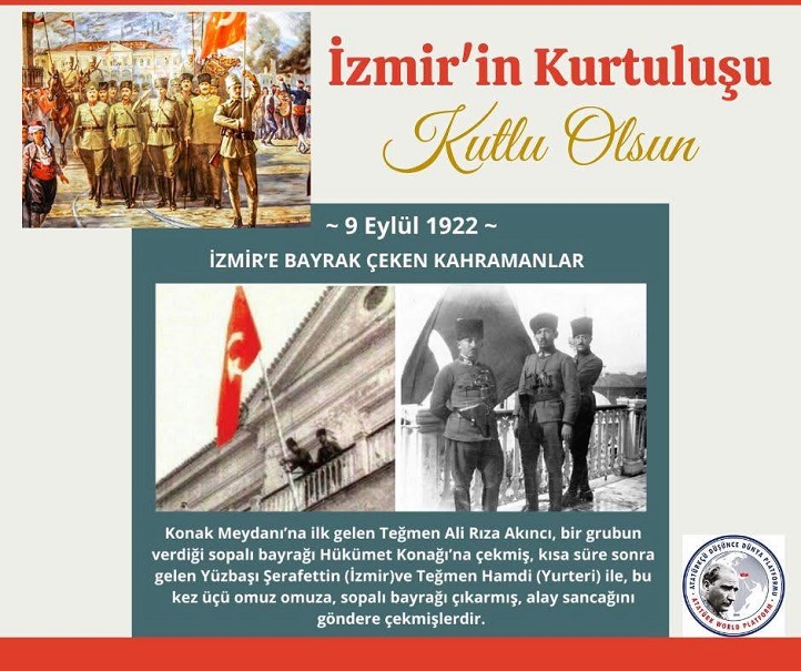 Atatürkçü Düşünce Dünya Platformu (ADDP) bir açıklama yayınladı. Ulusal Kurtuluş Savaşı’mız 19 Mayıs 1919 tarihinde Mustafa Kemal Paşa’nın Samsun’a ayak başmasıyla başlamış ve emperyalist işgalcileri 9 Eylül 1922 tarihinde İzmir’de denize dökmemizle son bulmuştur. İzmir’in kurtuluşu tüm Türklüğün kurtuluşu demektir.